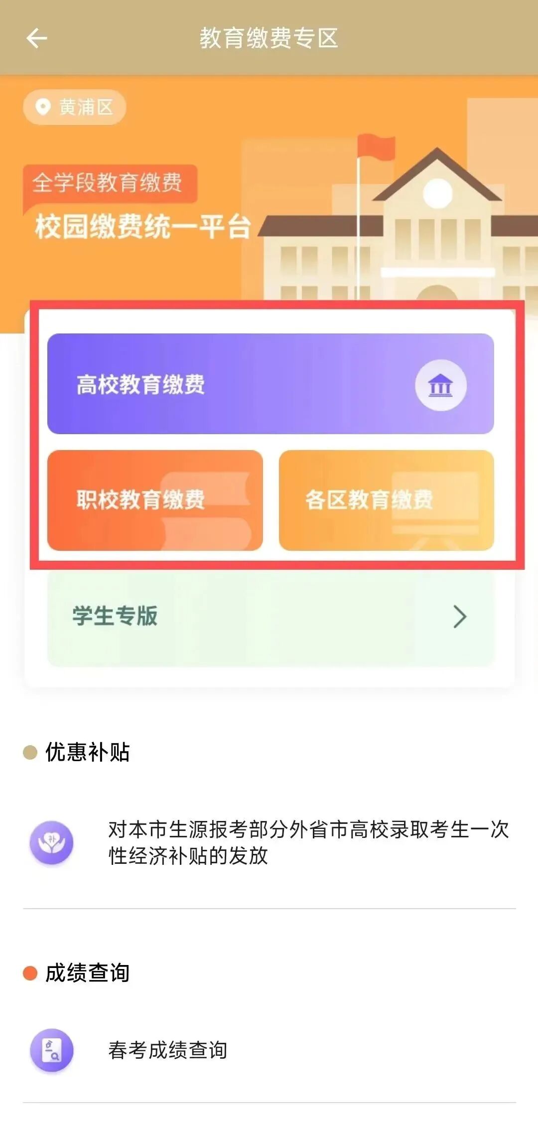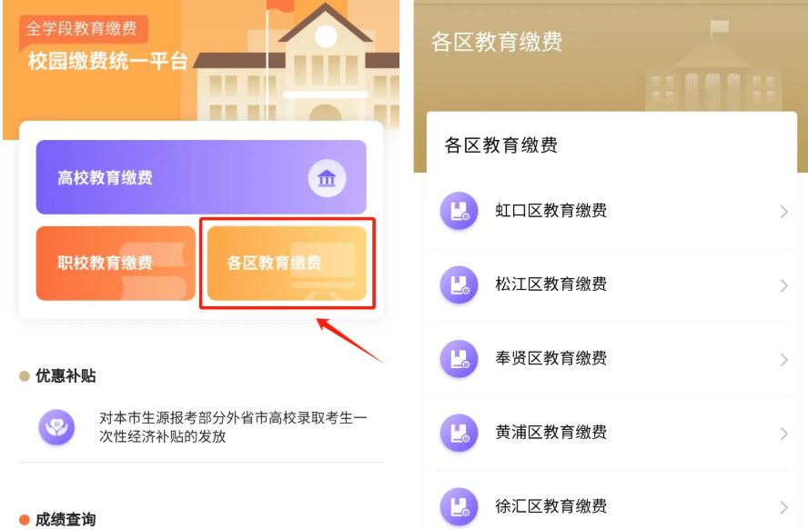 1、點(diǎn)擊“各區(qū)教育繳費(fèi)”,選擇就讀學(xué)校所在區(qū),進(jìn)入對應(yīng)繳費(fèi)平臺。目前已支持松江、黃浦、徐匯、長寧、虹口、奉賢區(qū)等統(tǒng)一在線繳費(fèi)。