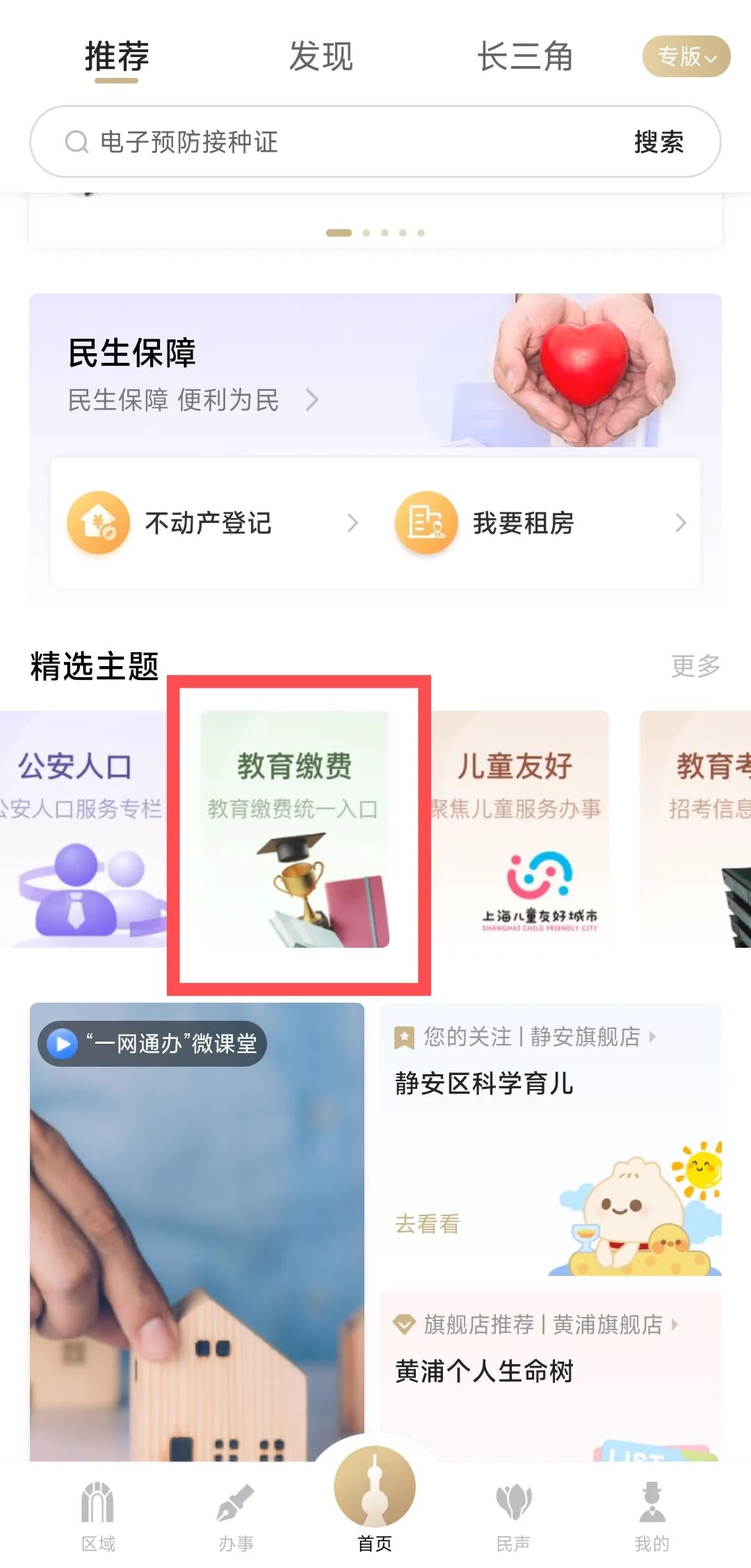 繳費(fèi)入口:打開“隨申辦市民云”APP,在首頁【精選主題】中找到“教育繳費(fèi)”,或通過關(guān)鍵詞搜索“教育繳費(fèi)”,選擇“教育繳費(fèi)專區(qū)”事項(xiàng),即可進(jìn)入服務(wù)。