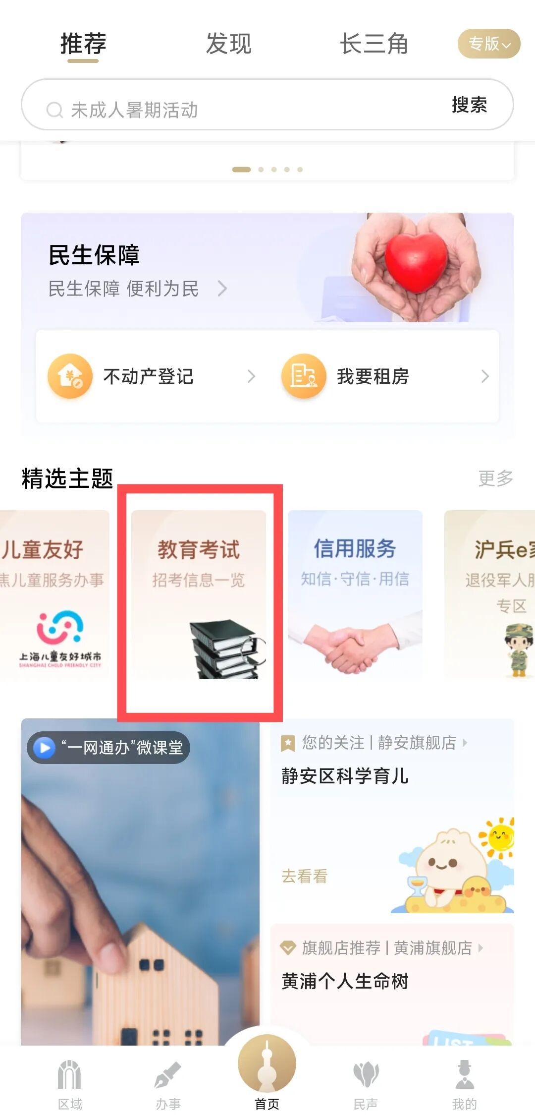 打開“隨申辦市民云”APP,在首頁輸入“教育考試”進(jìn)入教育考試招生專區(qū)。