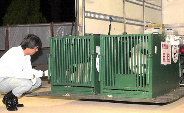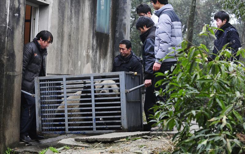 2011年2月20日,中國保護大熊貓研究中心雅安碧峰峽基地的工作人員在搬運大熊貓“仙女”,啟程前往東京上野動物園。新華社 圖