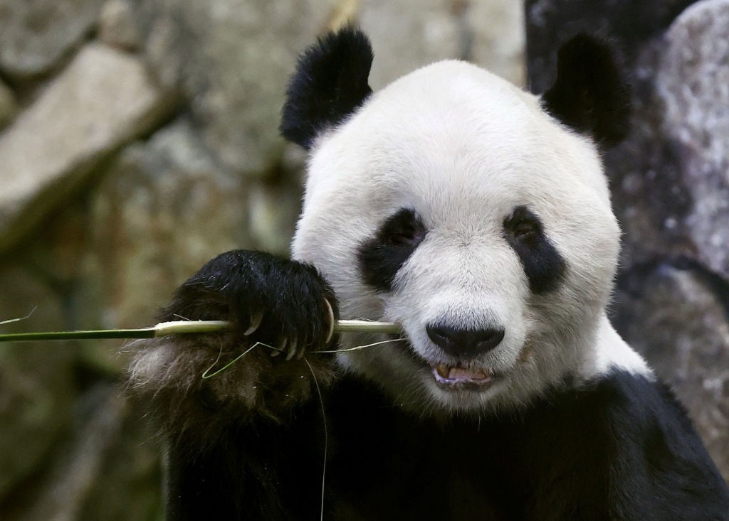 2023年2月21日,日本和歌山縣,白浜町“冒險世界”的“永明”享受著竹子大餐。