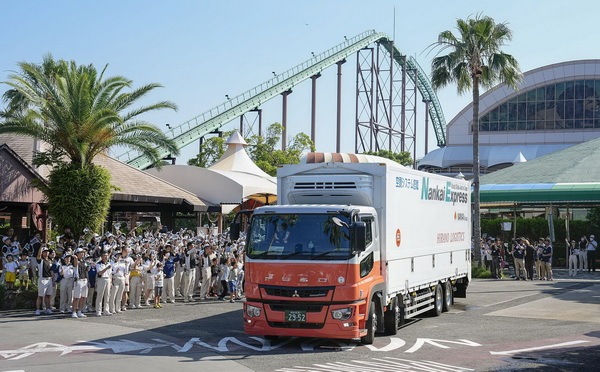 2025年6月28日,日本和歌山縣白濱町,工作人員與民眾在“冒險世界”外目送運輸大熊貓的卡車離開。