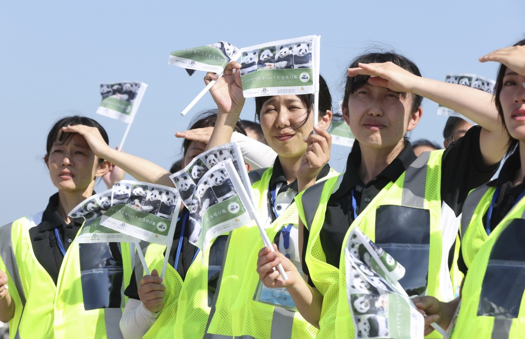 2025年6月28日,日本大阪關(guān)西國際機場,“冒險世界”工作人員為“良浜”“結(jié)浜”“彩浜”“楓浜”送行。