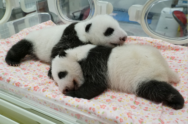 2021年7月1日,剛出生不久的大熊貓雙胞胎幼崽“曉曉”和“蕾蕾”。新華社 圖