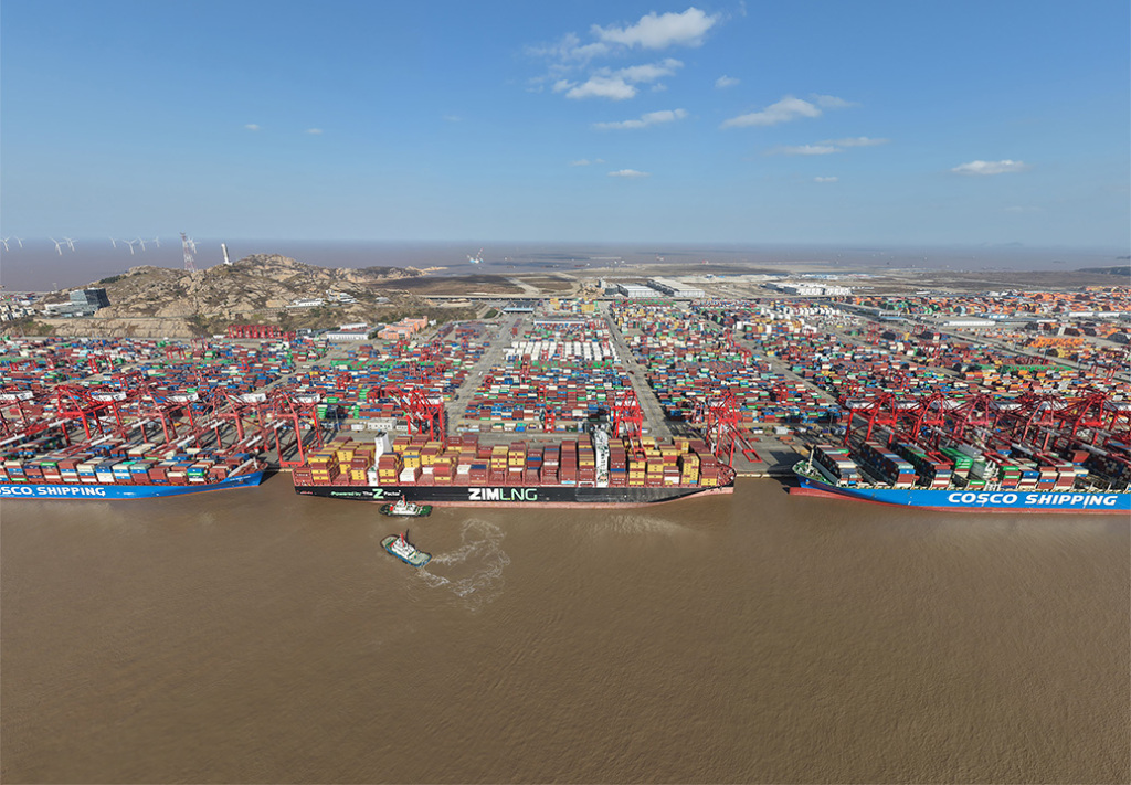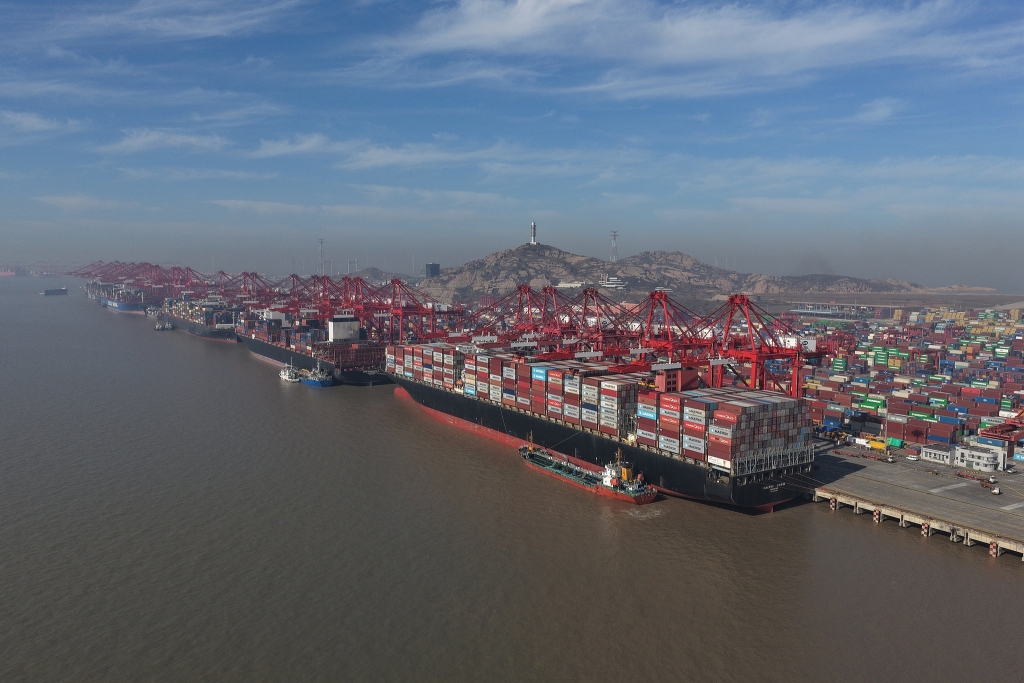 2025年11月30日,上海洋山港集裝箱碼頭,呈現(xiàn)一片繁忙的景象。 視覺中國 資料圖
