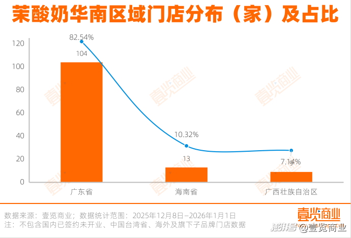 在華南區(qū)域,茉酸奶門店則極度依賴廣東省,海南省和廣西壯族自治區(qū)門店數(shù)合計(jì)不到廣東省門店數(shù)的四分之一。