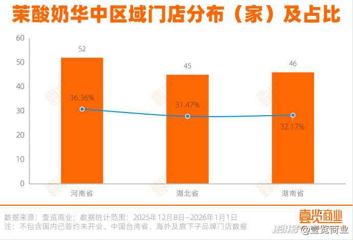 在華中區(qū)域,茉酸奶的門店分布呈現(xiàn)出三足鼎立的格局,河南、湖北、湖南占比均在30%上下。
