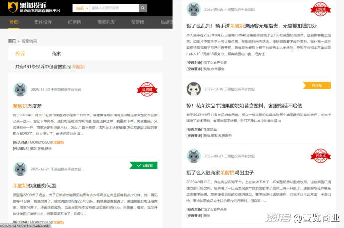二是茉酸奶的品牌口碑面臨考驗(yàn)。打開黑貓投訴平臺(tái),共有481條投訴中包含搜索詞茉酸奶,最近的幾條投訴內(nèi)容都是聚焦于茉酸奶的服務(wù)態(tài)度差,往下翻看可以看到關(guān)于眾多食品安全問(wèn)題以及外賣騎手相關(guān)問(wèn)題的投訴內(nèi)容,對(duì)品牌形象形成持續(xù)消耗。