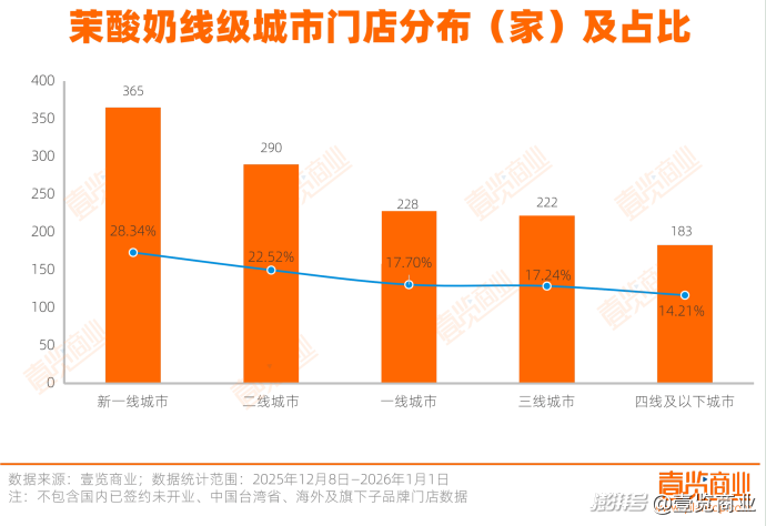 在城市拓展上,茉酸奶明顯傾向于高線城市。新一線城市是茉酸奶的絕對(duì)核心,以365家門店、占比28.34%的規(guī)模居于首位;二線城市以290家門店位列第二,一線城市排在第三。三線及以下城市門店數(shù)雖有405家,但分布相對(duì)分散,顯示出品牌在下沉市場(chǎng)仍處于嘗試階段。