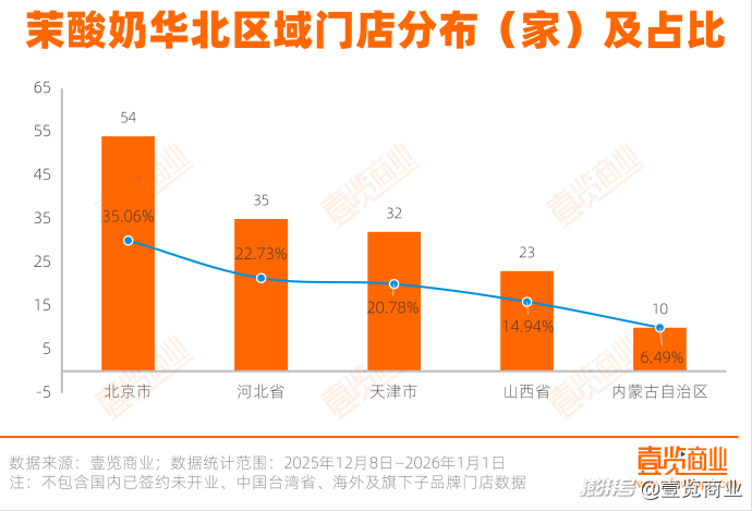 在華北區(qū)域,北京以54家門店成為大區(qū)核心;河北和天津分別有35家和32家,合計(jì)占比43.51%;山西與內(nèi)蒙古自治區(qū)的門店規(guī)模明顯較小,占比合計(jì)僅21.43%。