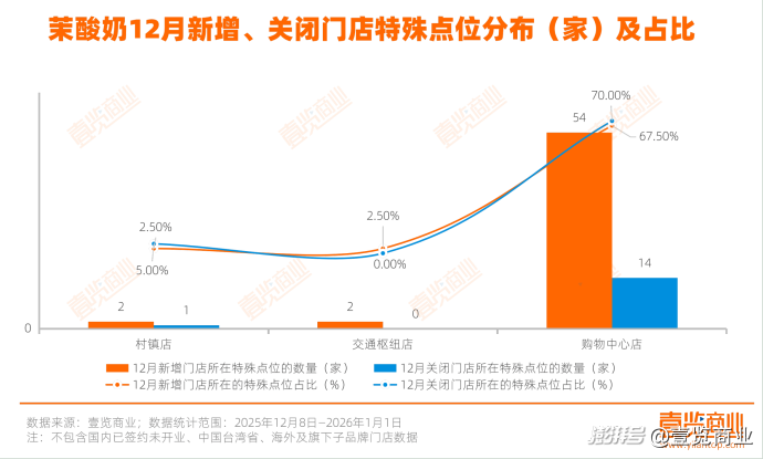 從特殊點(diǎn)位來(lái)看,12月門店調(diào)整的重心集中在購(gòu)物中心,70.00%的新增門店集中在此,而閉店門店也有67.50%。說(shuō)明品牌可能在用新開的優(yōu)質(zhì)點(diǎn)位,逐步替換掉盈利與運(yùn)營(yíng)效率較低的門店,從而提升整體盈運(yùn)能力。