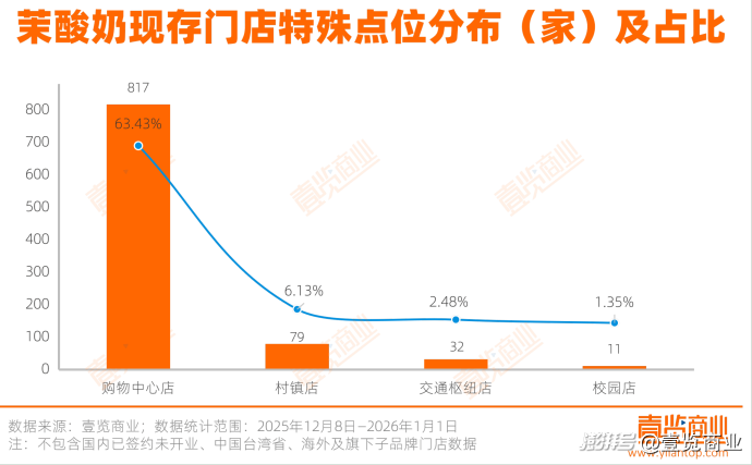 茉酸奶的門店選址則呈現(xiàn)鮮明的聚集性。購(gòu)物中心門店數(shù)量高達(dá)817家,占比63.43%,品牌希望通過(guò)購(gòu)物中心點(diǎn)位穩(wěn)定的客流基礎(chǔ),覆蓋年輕白領(lǐng)等核心客群,同時(shí)借助綜合體的品牌聚合效應(yīng)提升自身曝光度。