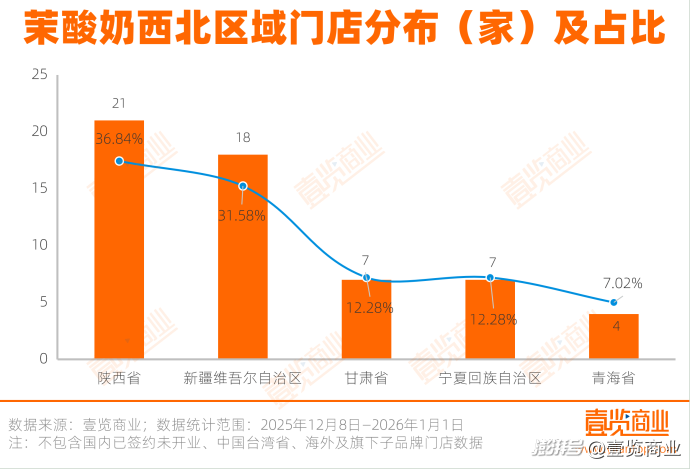 在西北區(qū)域,新疆與陜西一起占據(jù)了近七成市場(chǎng),青海是區(qū)域內(nèi)門店數(shù)量最少的,只有3家門店。