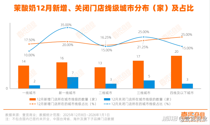 從城市線級(jí)來(lái)看,新增門店分布較為均衡。新增最多的是三線及以下城市,共新增37家,占比25%,說(shuō)明品牌正在積極探索向下沉市場(chǎng)滲透。三線城市的17家新增門店占比21.25%,與四線及以下城市共同構(gòu)成了12月近一半的新增數(shù)量。新一線與二線城市的新增門店合計(jì)占比37.5%,二線城市新增最少,僅貢獻(xiàn)16.25%的新增占比。