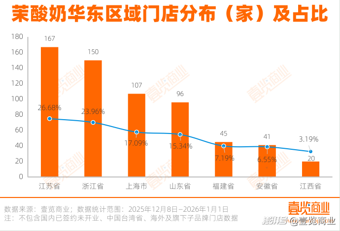 在華東內(nèi)部,江蘇省和浙江省為品牌貢獻(xiàn)了半數(shù)以上的門店;而作為直轄市的上海市,門店數(shù)高達(dá)17.09%居于第三;安徽、福建門店數(shù)剛過(guò)40家,占比合計(jì)超過(guò)13%;江西省的17家門店是區(qū)域內(nèi)占比最少的,僅3.19%。