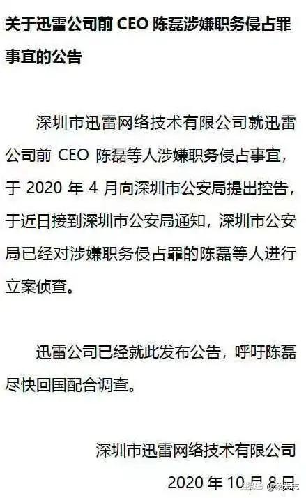 2020年4月陳磊被罷免后,隨即與董鱈出境并長期滯留境外。迅雷隨后報案稱其涉嫌職務(wù)侵占,雖被立案偵查,但因陳磊拒不配合,刑事程序無法推進,最終案件被撤銷。