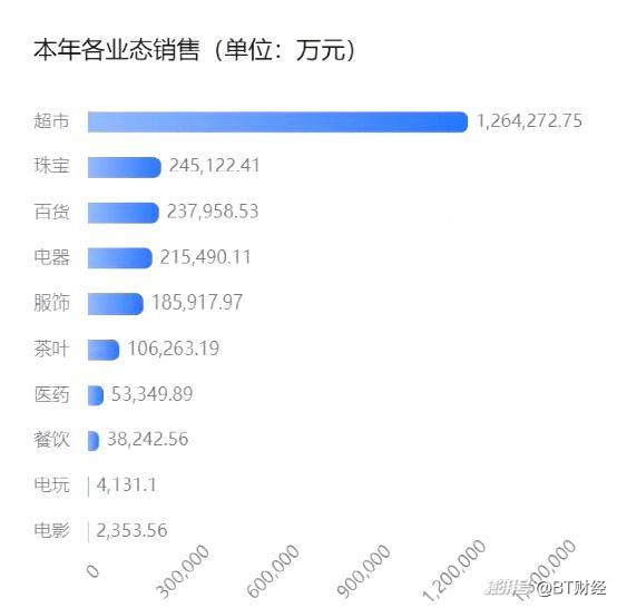 細(xì)分到具體營收構(gòu)成,超市營收126.43億元、珠寶營收24.51億元、茶葉營收10.63億元,其中時代廣場店年?duì)I收60億元,直接拿下單店銷冠。