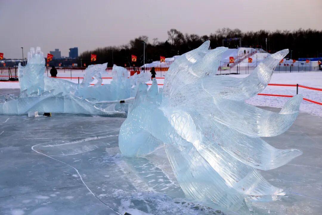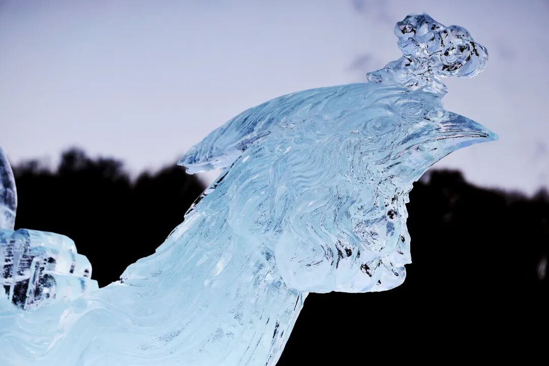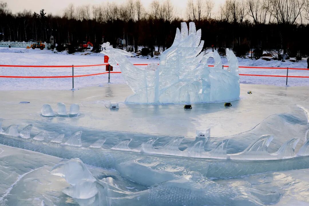 白樺林邊、雪滑梯旁,冰龍半臥于湖冰之上,身姿矯健,長(zhǎng)約45米,凌空約1米,昂首向云,鱗甲流轉(zhuǎn)天光,如有風(fēng)雷隱隱;冰鳳凰亭亭立于側(cè),高逾2米,長(zhǎng)約20米,頷首舒翼,翎羽輕漾冰輝,似帶星輝漫漫。