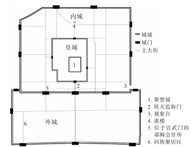 欽天監(jiān)最核心的職責(zé)是編制官方歷法。與中國歷代前朝一樣,清朝將歷法編制視為國家專屬事務(wù)。作為展示帝國權(quán)威的一種手段,每年十月的第一天,朝廷都會舉行隆重的典禮,頒布下一年的歷法。京師的所有政府機構(gòu)都派代表參加典禮,領(lǐng)取新歷法的副本。僅禮部就需要將幾百本歷法,分發(fā)給朝鮮王朝和安南王國,因為朝鮮王朝和安南王國這些清朝的藩屬國不能自主編制歷法。欽天監(jiān)在頒行典禮前總共要準備好67000多份漢語、蒙古文和滿文的新歷法。因此,新歷法的計算必須在更早的時候完成。法律規(guī)定,欽天監(jiān)必須在二月的第一天向皇帝呈交漢語歷法樣本。皇帝批準后,樣歷被譯為滿文、蒙古文并刊印副本。復(fù)制的樣歷在四月的第一天分發(fā)到各省,以便各省依此刊刻頒行。與明朝設(shè)南北欽天監(jiān)不同,清朝欽天監(jiān)的整個機構(gòu)都在北京。欽天監(jiān)有三個主要辦公場所(見下圖)。第一處是衙門,位于天安門和大清門之間的中央政府機構(gòu)區(qū)域,稍偏東側(cè)。衙門內(nèi)有各種下屬部門和倉房,用于存放檔案、文書及天文典籍。歷法推算、文書辦理等大多數(shù)官僚事務(wù)均在衙門內(nèi)進行。第二個主要辦公場所是位于北京內(nèi)城城墻東南角的觀象臺。觀象臺常年有官員值守,以便欽天監(jiān)能夠記錄所有天象異常,并即時為皇帝解讀。