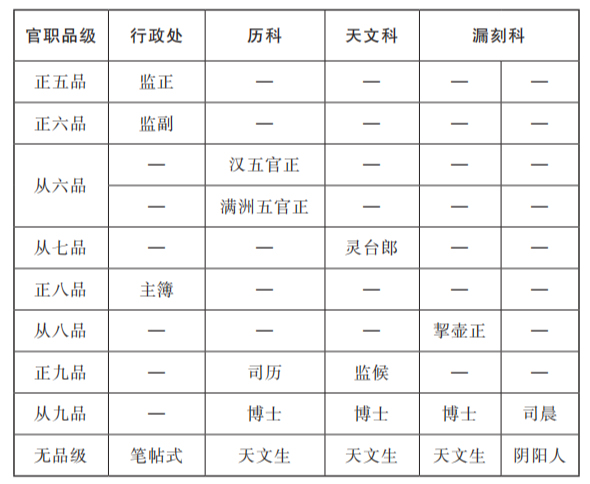 成為介于博士和歷科主管之間的唯一中級職位。司歷也僅僅是正九品,與其說是負責(zé)監(jiān)督其他官員的職位,不如說是最資深或業(yè)務(wù)最熟練的職位(見下表和下圖)。與博士和天文生一樣,司歷也需要定期參加考試,以證明其專業(yè)知識的穩(wěn)步進步。請注意,司歷這個職位僅面向漢族官員。