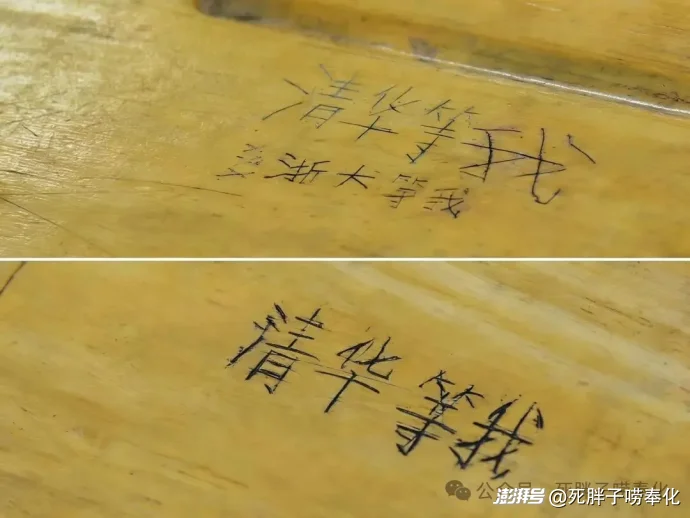 多年后,在奉化的校園里穿行,已經(jīng)很少見到。最近,去林老師的學(xué)校溜達。看到那有些年歲的木桌面上,密密麻麻,刻滿了“清華”、“北大”,后面常常跟著重重的“等我”。