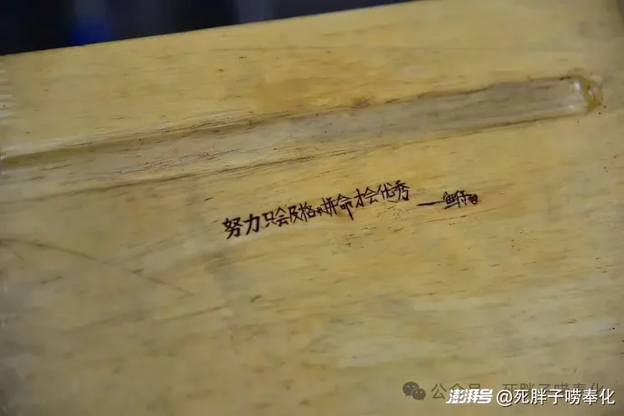 但作為一個過來人,胖子深知這幾個校名背后的千軍萬馬。知道從這張課桌到那扇校門之間,隔著多長的距離、多陡的坡。如今的我甚至沒有勇氣刻下類似的口號。