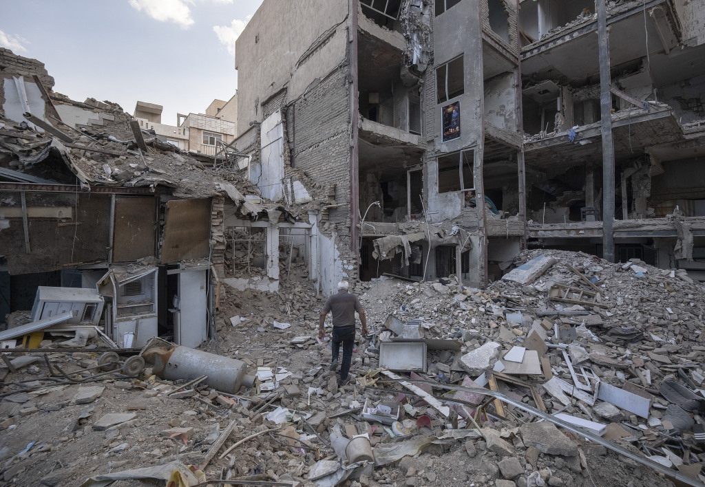 當(dāng)?shù)貢r(shí)間2025年7月21日,伊朗德黑蘭,日落時(shí)分,一名伊朗老人在伊朗與以色列12日戰(zhàn)爭(zhēng)中被摧毀的居民樓廢墟中行走。 視覺中國(guó) 圖