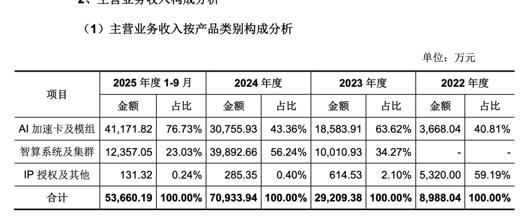 報(bào)告期各期,燧原科技96%以上的營(yíng)業(yè)收入來(lái)源于主營(yíng)業(yè)務(wù),其他業(yè)務(wù)收入主要來(lái)源于少量原材料轉(zhuǎn)售和設(shè)備租賃等。2025年1-9月份,燧原科技AI 加速卡及模組營(yíng)收為4.1億元,占比76.73%;智算系統(tǒng)及集群業(yè)務(wù)營(yíng)收為1.23億元,占比23.03%。