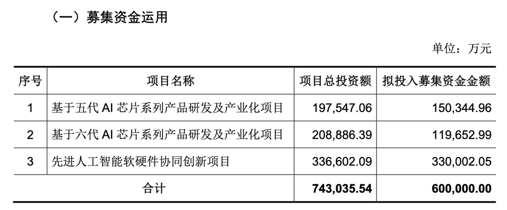 燧原科技本次IPO募資主要投向后續(xù)產(chǎn)品研發(fā)迭代,其中,基于五代AI芯片系列產(chǎn)品研發(fā)及產(chǎn)業(yè)化,項(xiàng)目總投資額為19.7億元,擬投入募資金額為15億元;基于六代 AI 芯片系列產(chǎn)品研發(fā)及產(chǎn)業(yè)化項(xiàng)目,總投資為20.8億元,募資投入金額為11.9億元;先進(jìn)人工智能軟硬件協(xié)同創(chuàng)新項(xiàng)目,總投資為33.6億元,募資投入為33億元。本輪募資總投入為60億元。