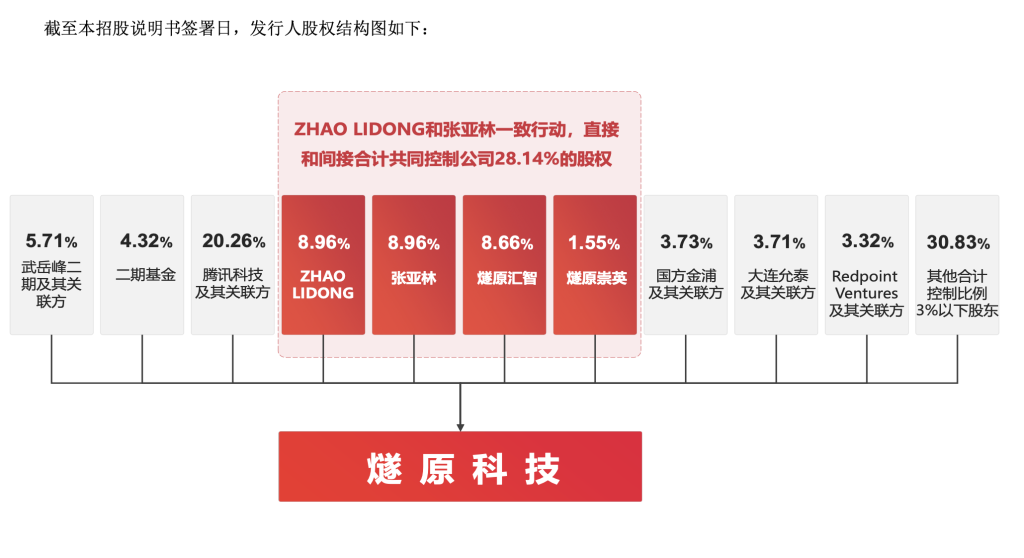 招股書顯示:ZHAO LIDONG(趙立東) 與張亞林為公司共同實(shí)際控制人。兩人均具有直接和間接支配公司股份的表決權(quán),且表決權(quán)比例相等。截至本招股說(shuō)明書簽署日,ZHAO LIDONG 直接持有公司8.9643%的股份,張亞林直接持有公司8.9643%的股份,二人共同擔(dān)任普通合伙人和執(zhí)行事務(wù)合伙人的員工持股平臺(tái)燧原匯智、燧原崇英合計(jì)持有公司 10.2070%的股份,兩人直接和間接合計(jì)控制公司 28.1357%的股份,遠(yuǎn)高于其他股東的表決權(quán)控制比例。