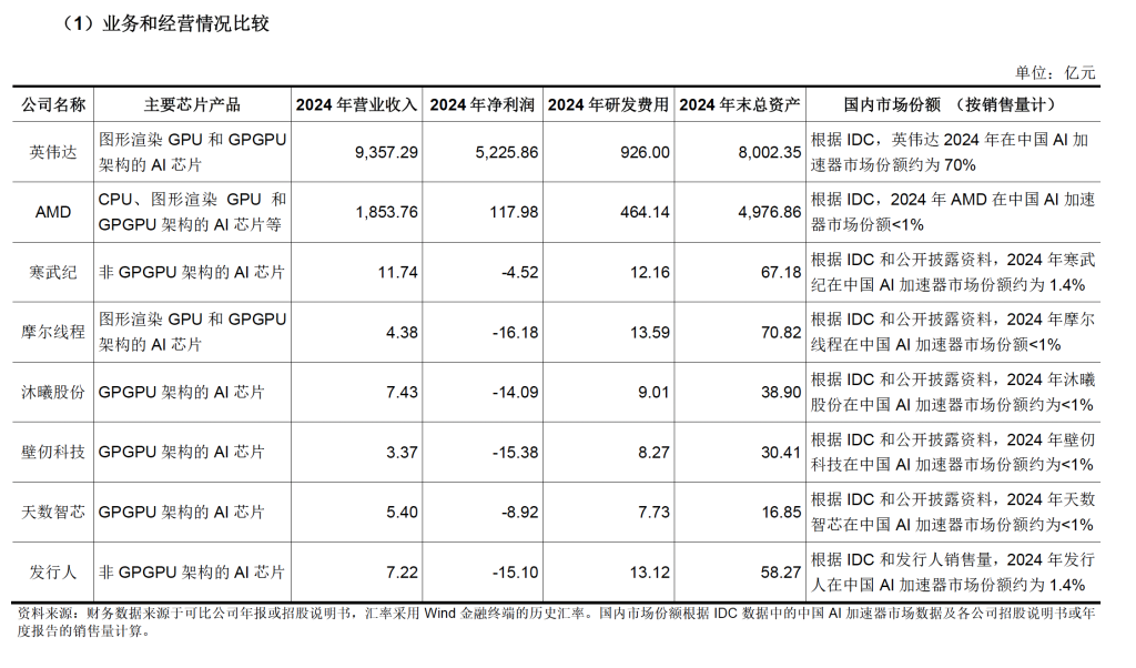 招股書顯示,目前國(guó)內(nèi)云端AI 芯片行業(yè)處于發(fā)展初期,國(guó)際廠商英偉達(dá)占據(jù)中國(guó)市場(chǎng)主要份額,但中國(guó)本土企業(yè)不斷突破技術(shù)壁壘,占據(jù)了一定的市場(chǎng)份額。中國(guó)本土云端AI芯片廠商包括以華為海思、寒武紀(jì)和燧原科技等為代表的非GPGPU(通用GPU)架構(gòu)廠商,以摩爾線程、沐曦股份、天數(shù)智芯和壁仞科技等為代表的GPGPU架構(gòu)廠商。公司2024年AI加速卡及模組銷售量達(dá)3.88萬(wàn)張,對(duì)應(yīng)中國(guó)AI加速卡市場(chǎng)的占有率約1.4%,在國(guó)內(nèi)其他AI芯片廠商中位居前列。