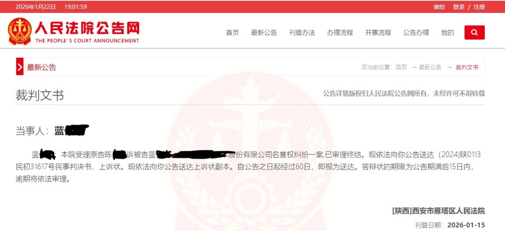 一審時,被告藍某某未到庭應訴,亦未提交書面答辯意見。一審判決后,由于無法聯(lián)系到藍某某,故法院于日前以公告送達形式向其送達一審判決書等。1月22日,陳某某表示,其認可一審判決結(jié)果,但因被告公司已提起上訴,故該判決尚未生效。