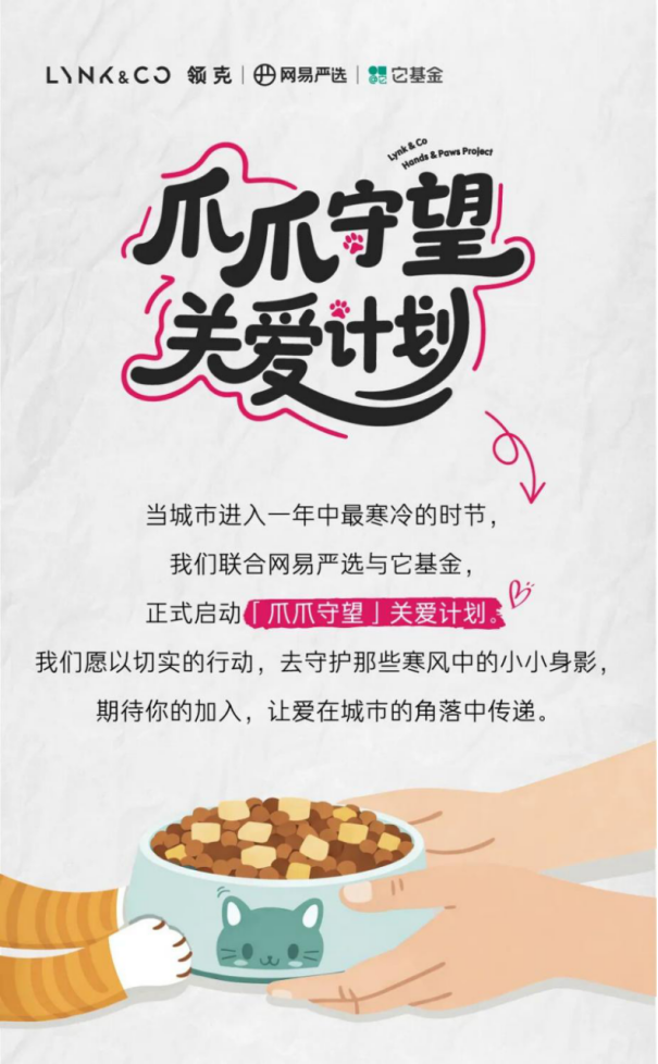 大寒已到,年關(guān)將至,街頭巷尾仍有小流浪們饑寒交迫的身影。當(dāng)萬家燈火亮起時,TA們還在尋找一頓溫飽。這個冬天,領(lǐng)克與網(wǎng)易嚴(yán)選、它基金三倍暖心聯(lián)手,讓愛不再流浪!一起成為城市角落里的“爪爪守望者”吧!
