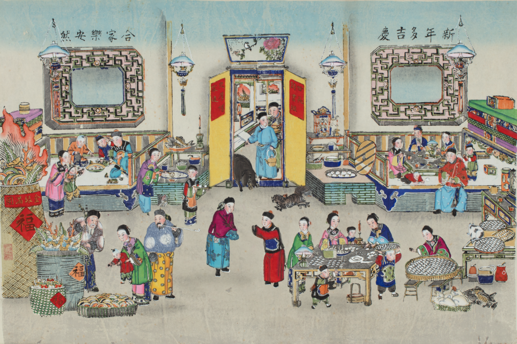 一件天津楊柳青版畫名為《新年多吉慶 合家樂(lè)安然》。這幅楊柳青年畫將清末北方除夕合家歡樂(lè)、團(tuán)年守歲的場(chǎng)景一一呈現(xiàn)。屋內(nèi)燈火通明,新?lián)Q門聯(lián)喜慶吉祥,肥豬拱門寓意富足。吃過(guò)年夜飯,婦女們正圍桌包“更歲餃子”。兩位青年互相作揖道喜,一人特意露出腰間新佩懷表,惹人注目??簧希焕夏陭D人與兒孫晚輩繞桌圍坐,邊聊天邊飲酒守歲。桌上未吃完的年夜飯之魚,取意年年有余。另一側(cè),幾個(gè)兒童正擲骰博戲,旁邊放著幾串新收的壓歲錢。灶火通紅,蒸籠里大饅頭熱氣騰騰,鍋內(nèi)水餃不停翻滾。神龕上新接灶神,香燭五供俱全。院內(nèi)屋內(nèi)皆是財(cái)寶滿囤,聚寶盆寶光熠熠生輝。門兩側(cè)的花窗上書“新年多吉慶,合家樂(lè)安然”點(diǎn)明主題。