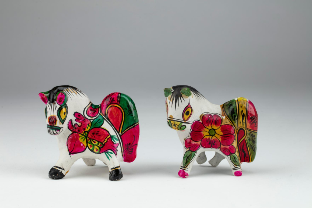 來(lái)自陜西鳳翔的馬泥塑憨態(tài)可掬。陜西鳳翔泥塑造型多樣,其中動(dòng)物造型的泥玩具多以十二生肖為原型,如坐虎、馬、豬、兔等。其風(fēng)格古樸可愛(ài),造型飽滿,輪廓流暢,整體簡(jiǎn)練概括又鮮活生動(dòng)。藝人們以現(xiàn)實(shí)生活為藍(lán)本,融入想象與創(chuàng)造,塑造時(shí)多突出動(dòng)物正面形象,更重神韻而非形似。這些泥塑既供孩子玩耍,又具辟邪納福的功用,如當(dāng)?shù)睾⒆訚M月時(shí),長(zhǎng)輩會(huì)送坐虎,祝福健康富貴。裝飾分彩繪與素繪兩類:彩繪色彩鮮艷明快、對(duì)比強(qiáng)烈,視覺(jué)沖擊力強(qiáng);素繪則以墨線勾勒,簡(jiǎn)潔優(yōu)雅。所繪紋樣均具吉祥寓意,寄托著人們對(duì)美好生活的向往。
