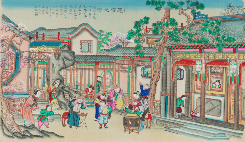 天津楊柳青版畫《慶賞元宵》圖繪元宵佳節(jié)場(chǎng)景,后庭小院內(nèi),婦女和兒童擊鑼打鼓,敲鈸吹號(hào),或手舉花燈,游戲其間。圖左,一婦人牽著戴紅風(fēng)帽、穿綠衣粉褲的女孩,女孩手中舉紅色金魚花燈出門游玩。畫廊之下,穿綠馬褂、戴紅暖帽的兒童雙手推著“捻捻轉(zhuǎn)”小花燈,獨(dú)自前來(lái)嬉戲。雕梁懸掛明角宮燈,紅綢結(jié)彩,壁燈彩畫芝蘭,照亮走廊。上元燈景的節(jié)日氣氛,更顯歡樂(lè)喜慶。圖上題詩(shī)一首:“金吾不禁逐年新,鼓吹升平共鬧春。最好家家饒樂(lè)趣,買燈三日更歡欣。”后署題記有“癸卯”及“高蔭章桐軒氏”字樣,可知此圖為晚清名畫家高桐軒作,繪刻年代為1903年。r