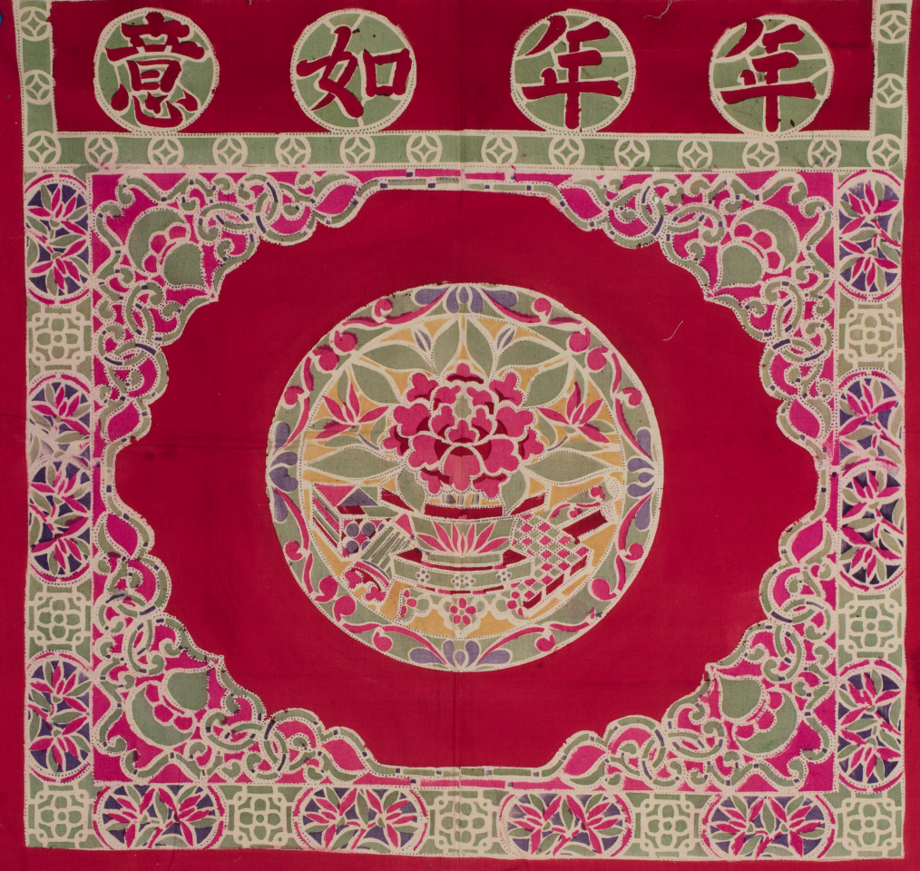 一件年年如意紋彩印桌圍,上方以“年年如意”為題,下方中心部位是圓形適合圖案,表現(xiàn)牡丹花盆和琴棋書畫代表的“四藝”題材,寄寓生活富貴、精神豐盈。桌圍四周以中心對(duì)稱的方式分布葫蘆、蓮花、藤蔓等紋樣,寓意福祿綿延、生生不息。
