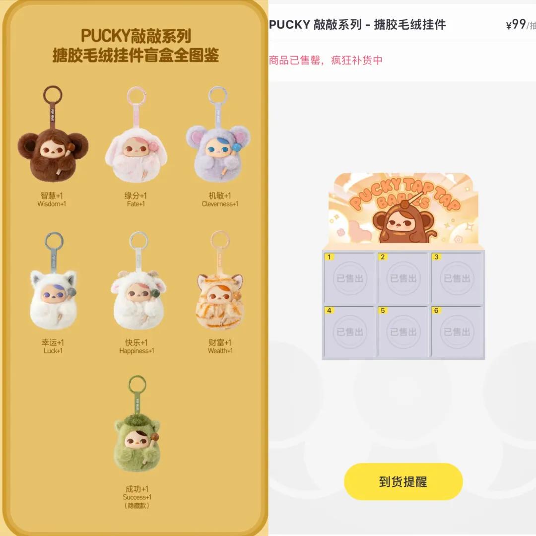 1月15日,泡泡瑪特發(fā)售了一個(gè)新的搪膠毛絨系列——PUCKY敲敲系列。因?yàn)閮?nèi)置發(fā)聲裝置,輕敲毛絨掛件,會(huì)發(fā)出清脆的木魚聲,加上掛件取名寓意十足,叫“財(cái)富+1”“幸運(yùn)+1”“快樂+1”,完美契合了年輕人“解壓+祈福”的需求,該系列迅速走紅,被網(wǎng)友戲稱為“電子木魚”。