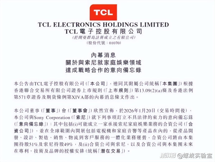 1月20日晚,TCL電子在港交所發(fā)布公告,宣布與索尼公司簽署意向備忘錄,計(jì)劃成立一家承接索尼家庭娛樂業(yè)務(wù)的合資公司,由TCL電子持股51%、索尼持股49%。