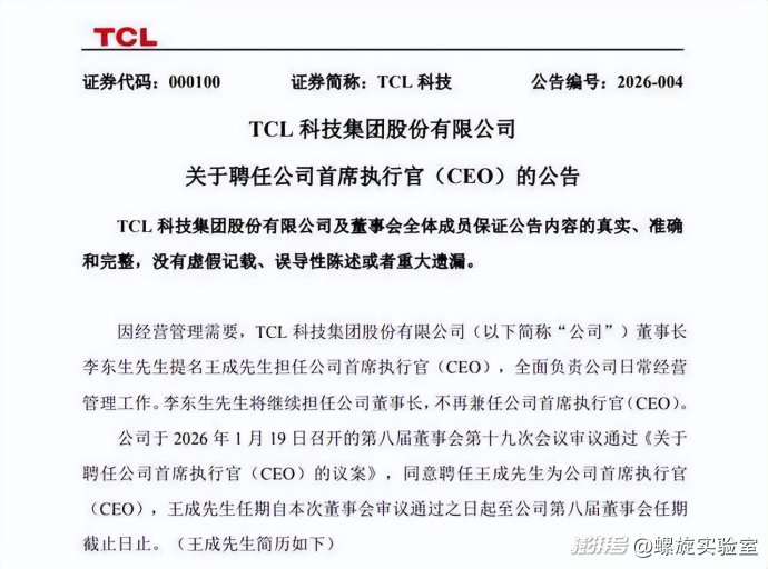 就在索尼與TCL簽署合作意向備忘錄的同時(shí),TCL科技集團(tuán)發(fā)布了一則人事變動(dòng)公告:創(chuàng)始人李東生卸任CEO職務(wù),僅保留董事長一職,由70后“老將”王成接任CEO。