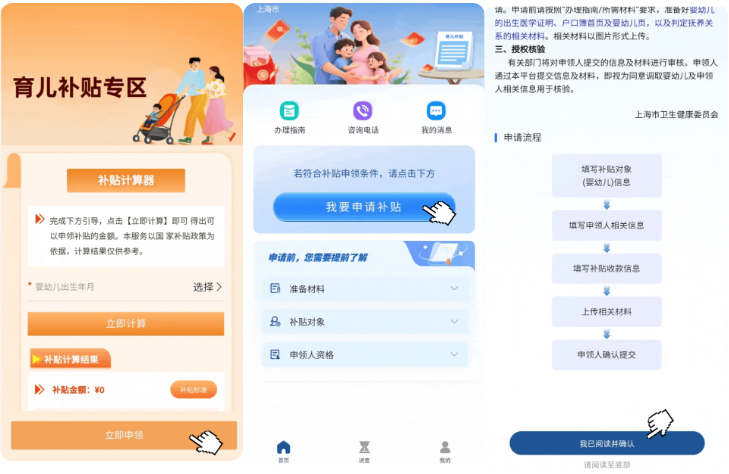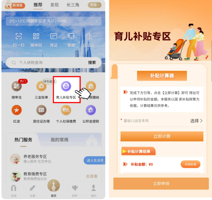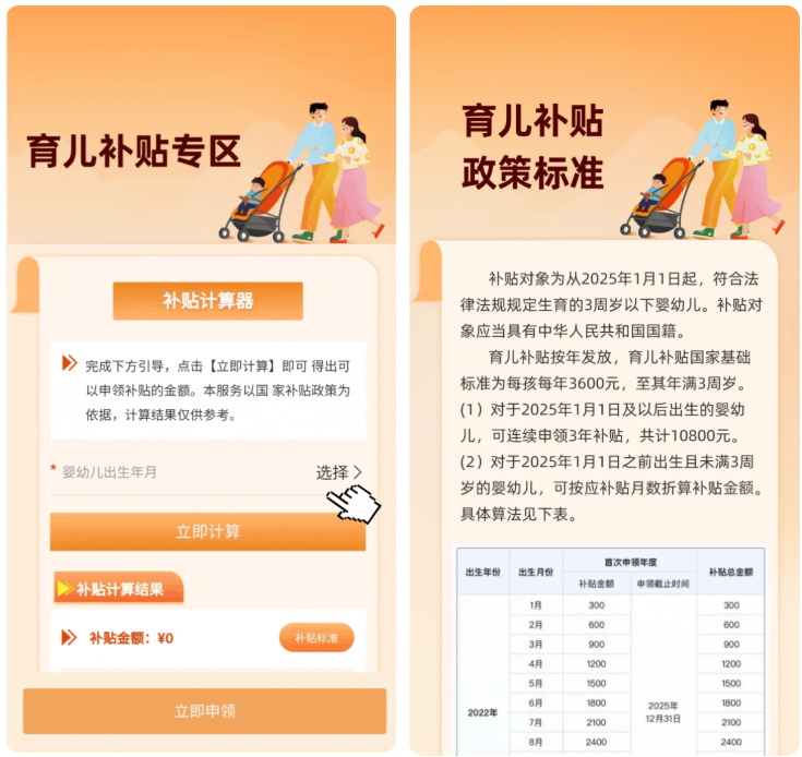 2、進(jìn)入專區(qū)頁(yè)面后,輸入寶寶的出生年月,即可通過(guò)“補(bǔ)貼計(jì)算器”快速計(jì)算補(bǔ)貼金額,還可一鍵查看相關(guān)補(bǔ)貼政策標(biāo)準(zhǔn)。