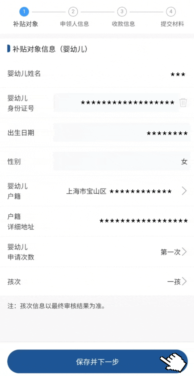 4、完善補(bǔ)貼對(duì)象信息,確保嬰幼兒個(gè)人信息準(zhǔn)確無(wú)誤后,點(diǎn)擊“下一步”。
