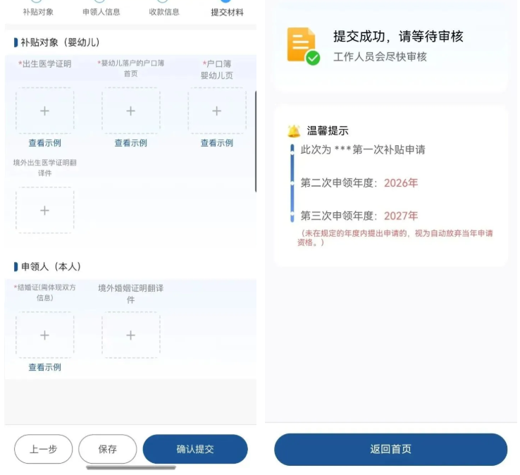 7、按頁(yè)面提示上傳嬰幼兒(補(bǔ)貼對(duì)象)的出生醫(yī)學(xué)證明、戶口薄首頁(yè)及嬰幼兒頁(yè),以及判定撫養(yǎng)關(guān)系的相關(guān)材料,確認(rèn)提交后等待審核結(jié)果。