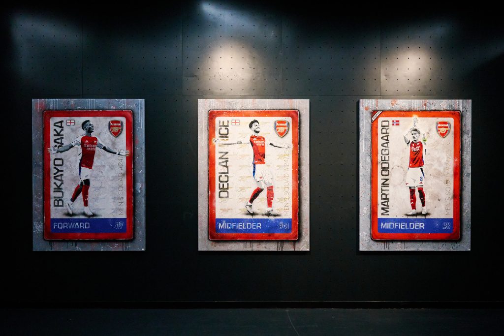 球員系列則聚焦于阿森納故事中個體的力量,是整個展覽中最能點(diǎn)燃個人記憶的部分。厄德高的靈光、賴斯的堅(jiān)毅、薩卡的鋒芒,還有傳奇隊(duì)長亞當(dāng)斯穿越時光而來的鐵血風(fēng)骨,都以充滿生命力的方式在畫布上奔騰。藝術(shù)家的創(chuàng)作并未追求寫實(shí)肖像,而是捕捉每位球員獨(dú)一無二的“氣場”,通過動作、色彩與動態(tài)線條傳達(dá)情緒印象與精神特質(zhì)。其中,《收藏品》系列作品的視覺靈感,來源于懷舊風(fēng)格的交易卡,將阿森納現(xiàn)役球員與歷史上的傳奇球員,轉(zhuǎn)化為可收藏的藝術(shù)瞬間。