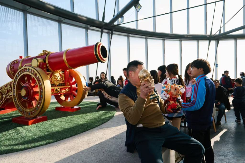位于好望南角C位的“三獅槍手”加農(nóng)炮裝置,既溯源阿森納百年兵工廠的經(jīng)典傳承,也是對酋長球場門前標(biāo)志的藝術(shù)化復(fù)刻。它的設(shè)計(jì)融合了英國宮廷巴洛克美學(xué)元素,炮身的三尊獅首呼應(yīng)英格蘭足球“三獅軍團(tuán)”的深厚底蘊(yùn);炮輪上的人形裝飾,則凝練了阿森納各個時代傳奇球員的風(fēng)采。加農(nóng)炮裝置與玻璃幕墻上貼附的《流行》系列徽章同框,形成歷史、藝術(shù)與現(xiàn)代都市的奇妙對話。
