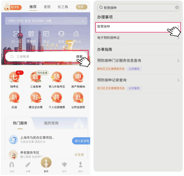 1、家長(zhǎng)打開“”隨申辦市民云APP,首頁搜索“智慧接種”,點(diǎn)擊進(jìn)入對(duì)應(yīng)服務(wù)。