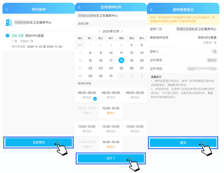 5、進(jìn)行預(yù)約接種,選擇預(yù)約時(shí)間并進(jìn)行預(yù)約確認(rèn)。完成預(yù)約后,根據(jù)預(yù)約時(shí)間準(zhǔn)時(shí)前往醫(yī)院接種疫苗。