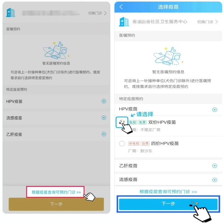 3、支持根據(jù)疫苗查詢可預(yù)約門診。選擇對(duì)應(yīng)的門診、HPV疫苗,點(diǎn)擊“下一步”。