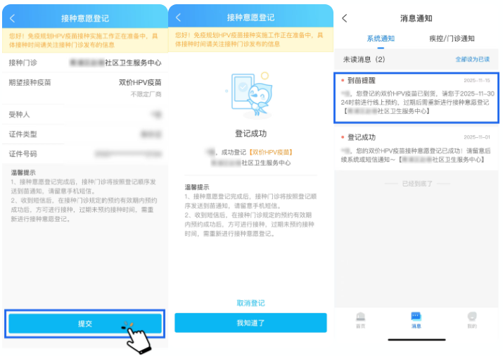 4、完成接種意愿登記,接種門診到苗后,將收到短信及系統(tǒng)通知。