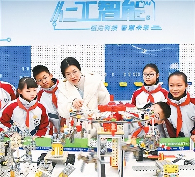 1月15日,浙江省建德市壽昌第一小學(xué)科技社團(tuán)的老師在人工智能Al工坊教室里,向?qū)W生講解旋轉(zhuǎn)木馬、摩天輪等一批積木機(jī)器人的實(shí)踐運(yùn)用科學(xué)知識(shí)。寧文武攝(人民視覺(jué))